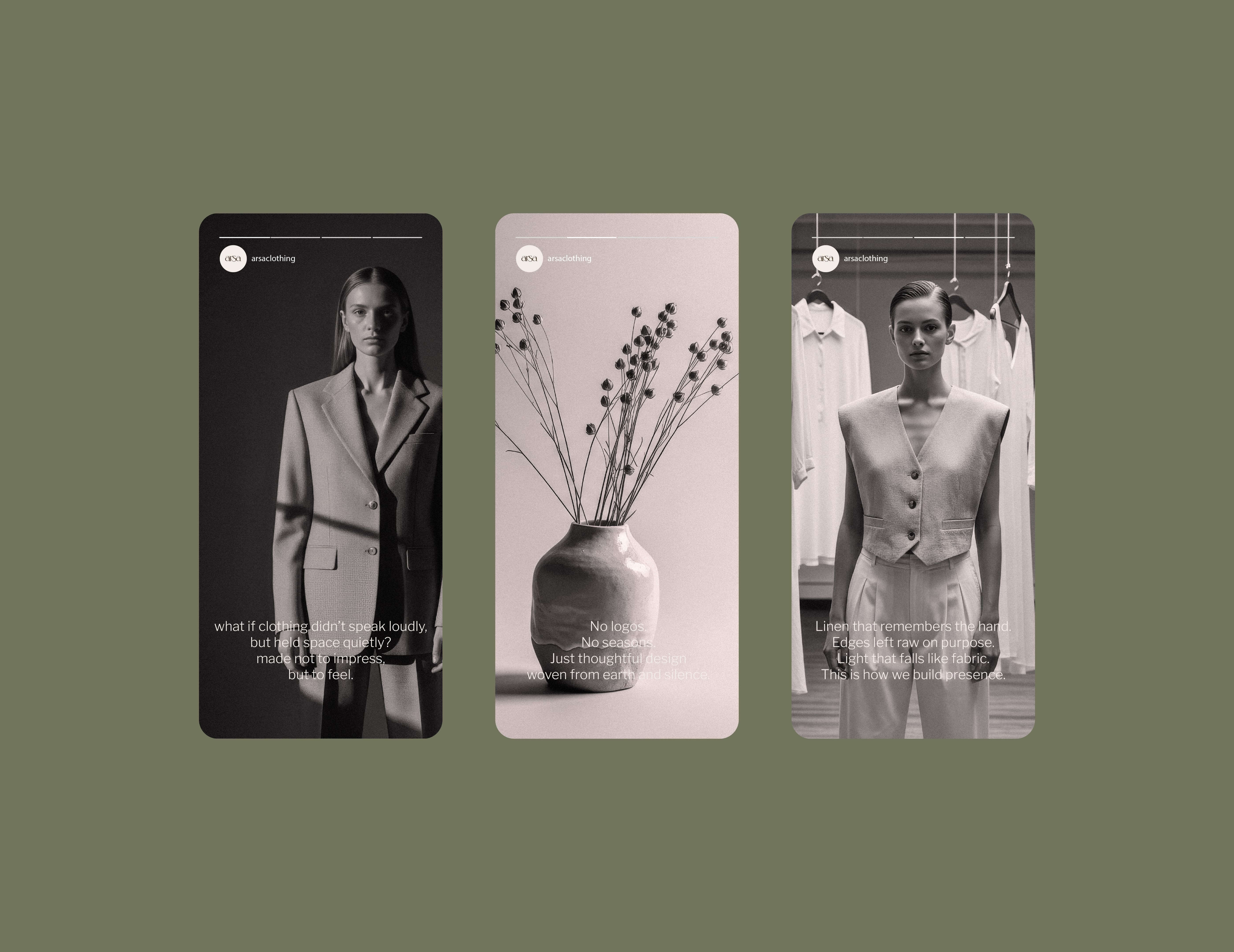 the final result is a cohesive and emotionally resonant brand identity that reflects the values of calm, tactility, and timelessness. arsa now communicates through a visual language that favors atmosphere over noise, rooted in natural materials and slow beauty. the logo conveys elegance without ornament, while the earthy color palette connects the viewer to the brand’s raw, grounded essence. typography supports quiet sophistication, and the photography evokes emotion through subtlety and depth. this holistic approach to brand building created a distinctive presence that invites introspection, connection, and loyalty, establishing arsa as a thoughtful alternative in the landscape of fast fashion.