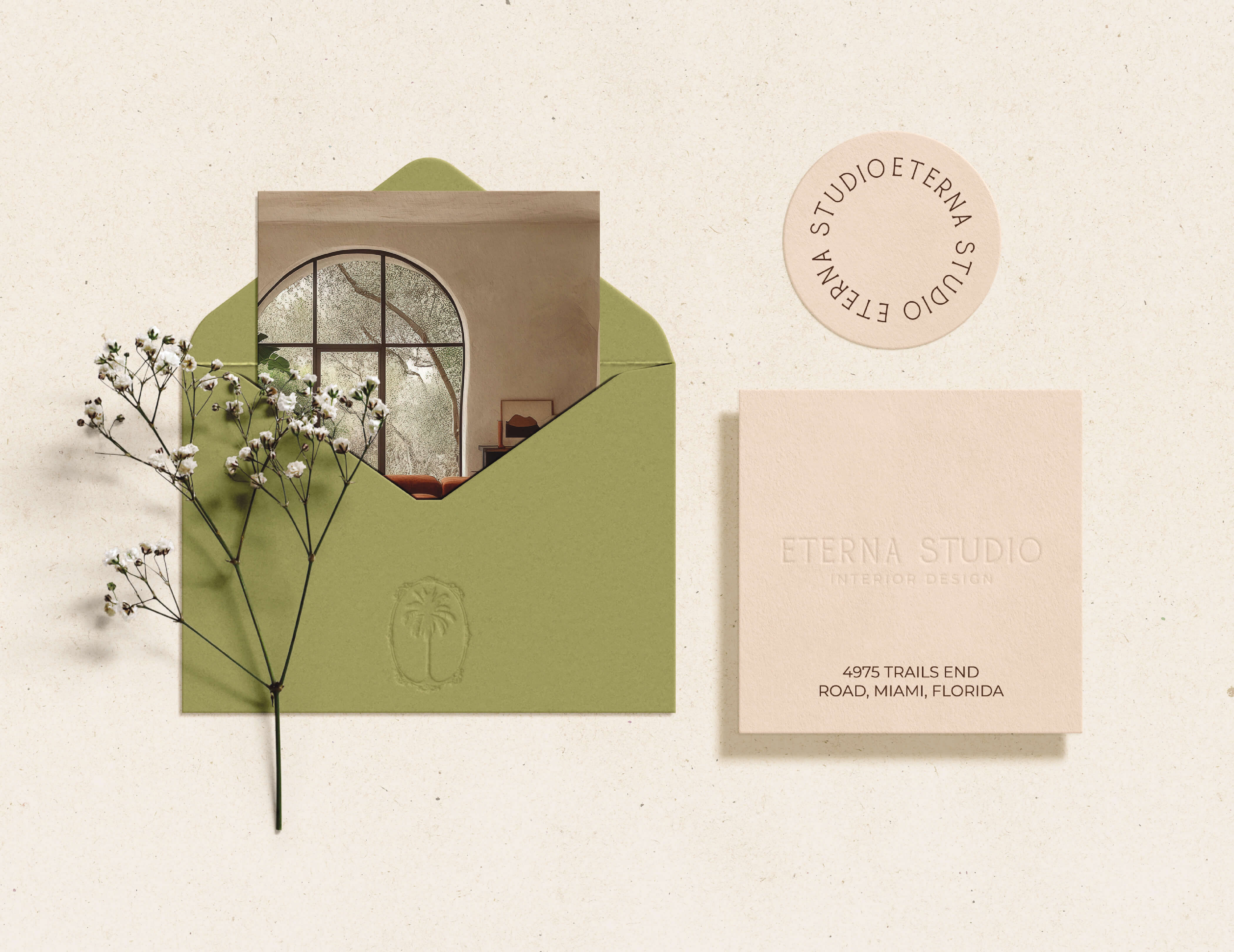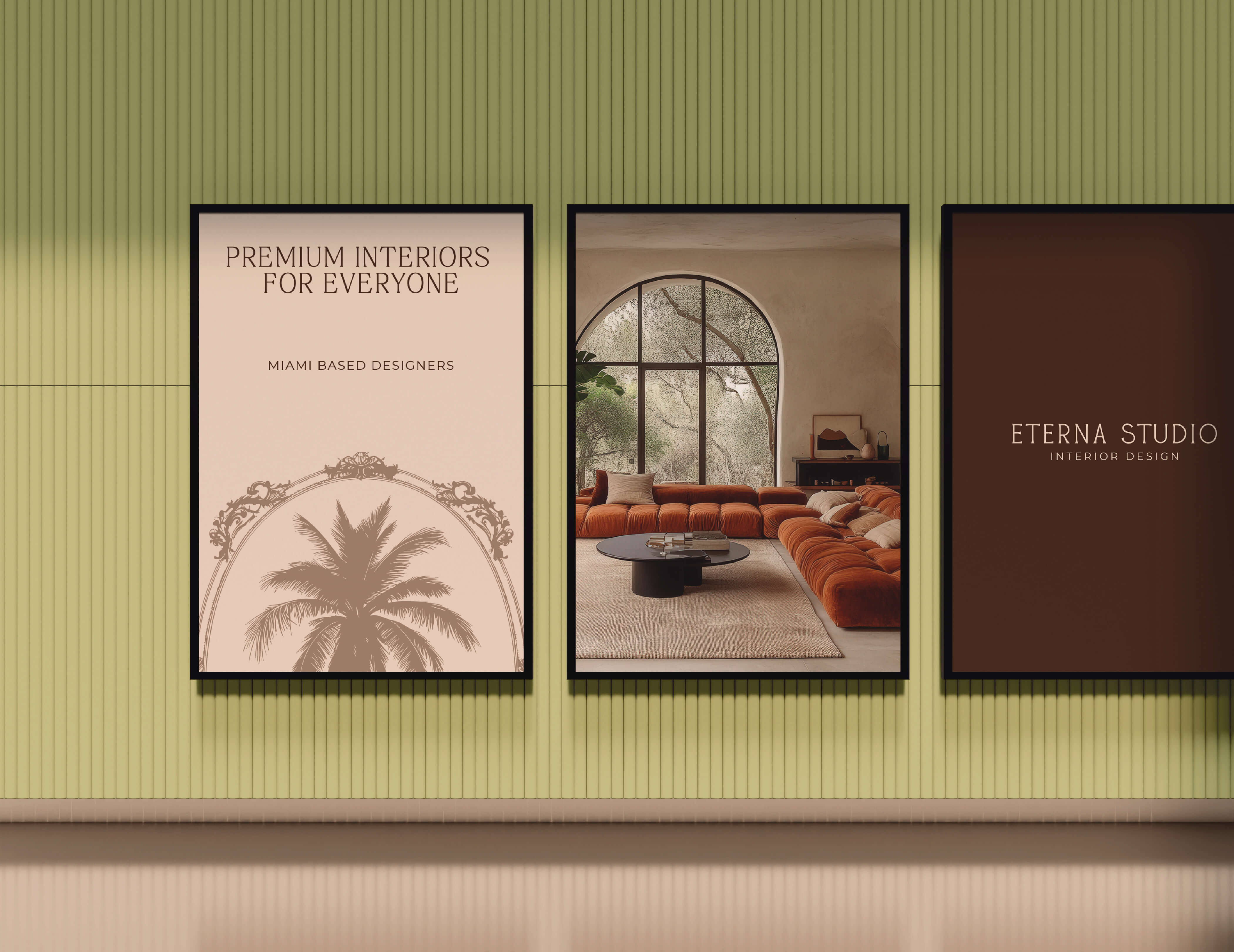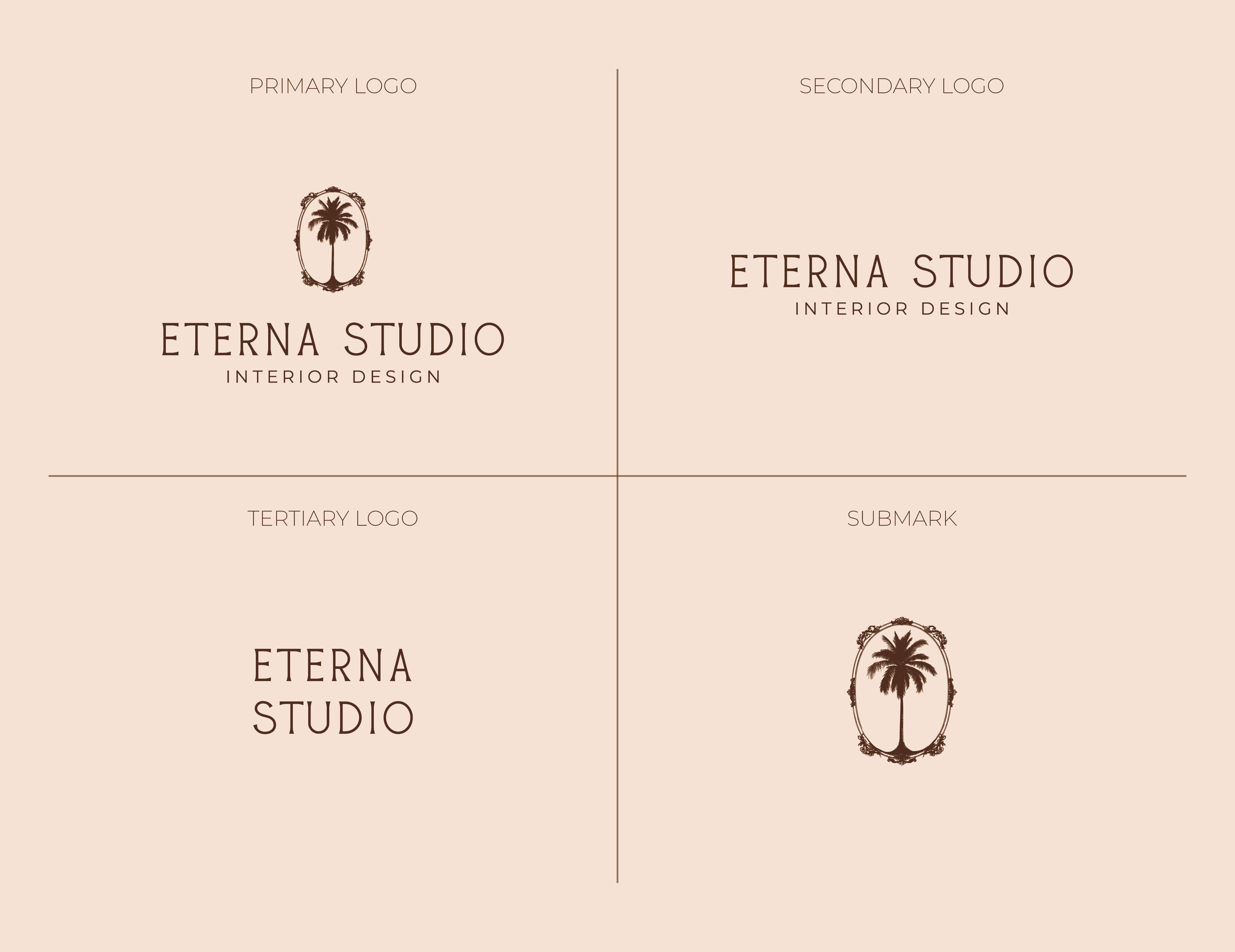 The palm tree motif was chosen for its symbolism of growth, nature, and tranquility, reflecting both Miami’s essence and Eterna Studio’s design philosophy. Combined with a clean serif typeface and an elegant oval frame, the logo strikes a balance between approachability and exclusivity. This timeless design appeals to Eterna Studio’s sophisticated audience, seeking bespoke interiors.